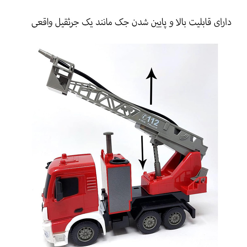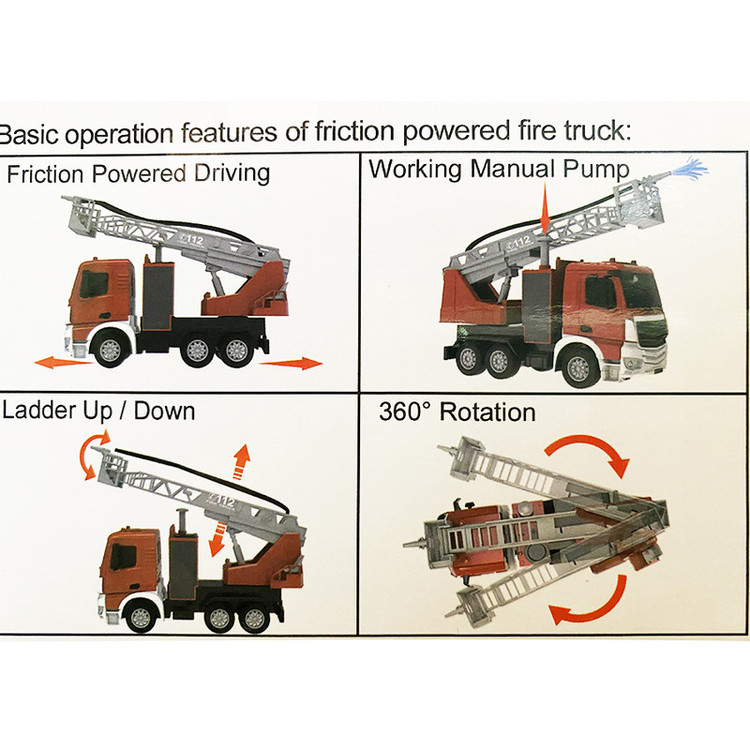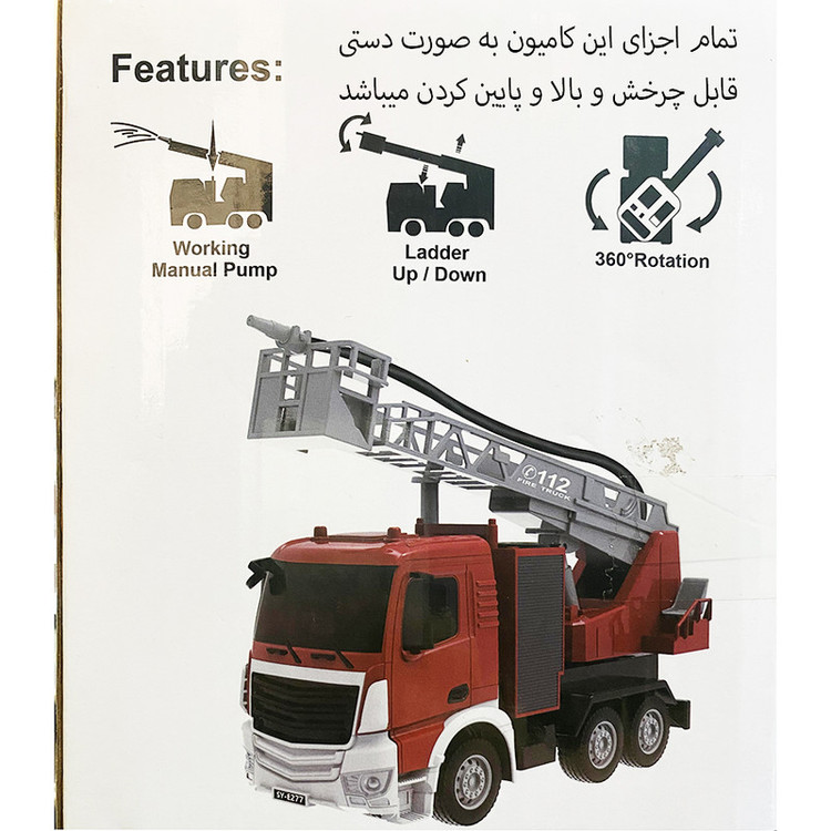 ماشین کامیون آتشنشانی شامل یک کامیون آتشنشانی با قابلیت آبپاشی است که دارای مخزن کوچک آب بروی ماشین است و آن از طریق شیلنگ موجود بروی ماشین به قسمت بالایی هدایت میشود و آب را با استفاده از دکمه روی کامیون به سمت هدف شلیک میکند.این ماشین آتش نشانی اسباب بازی از جزئیات بسیاری تشکیل شده است که دارای یک ماشین اسباب بازی به رنگ قرمز با نشانه های از آتش نشانی و دارای شش چرخ میباشد.نردبان آتش نشانی که به صورت دستی باز و بسته میشود و 360 درجه قابلیت چرخش دارد، مخزن آب و شیلنگ آب که قابلیت پرتاب آب دارد و بسیاری از جزئیات یک ماشین آتشنشانی عالی را به نمایش میگذارد.